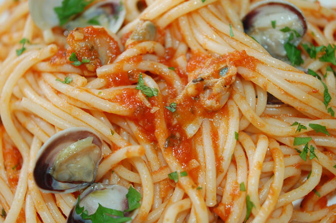 Cuando estén abiertas las almejas, añadir los espaguetis hervidos, poner perejil picado, remover todo y servir.